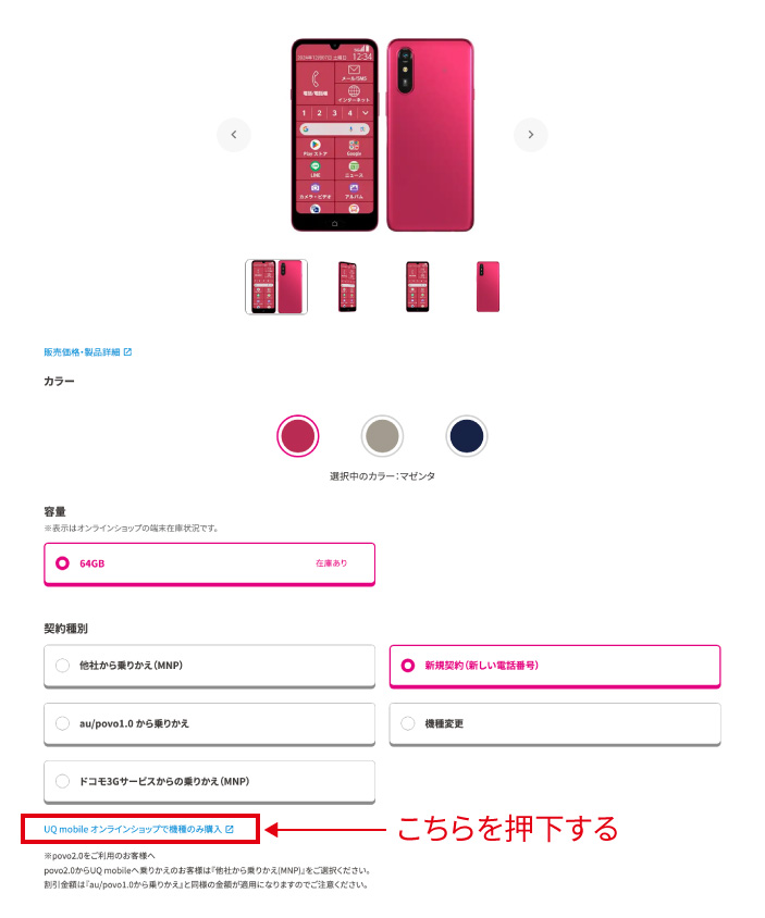 「オンラインショップで機種のみ購入」を押下します。