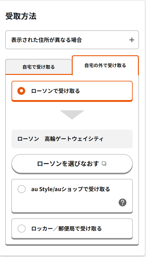 1.au Online Shop・UQ mobile オンラインショップでの購入時、受取方法の選択画面において「自宅以外で受け取る」タブを選択